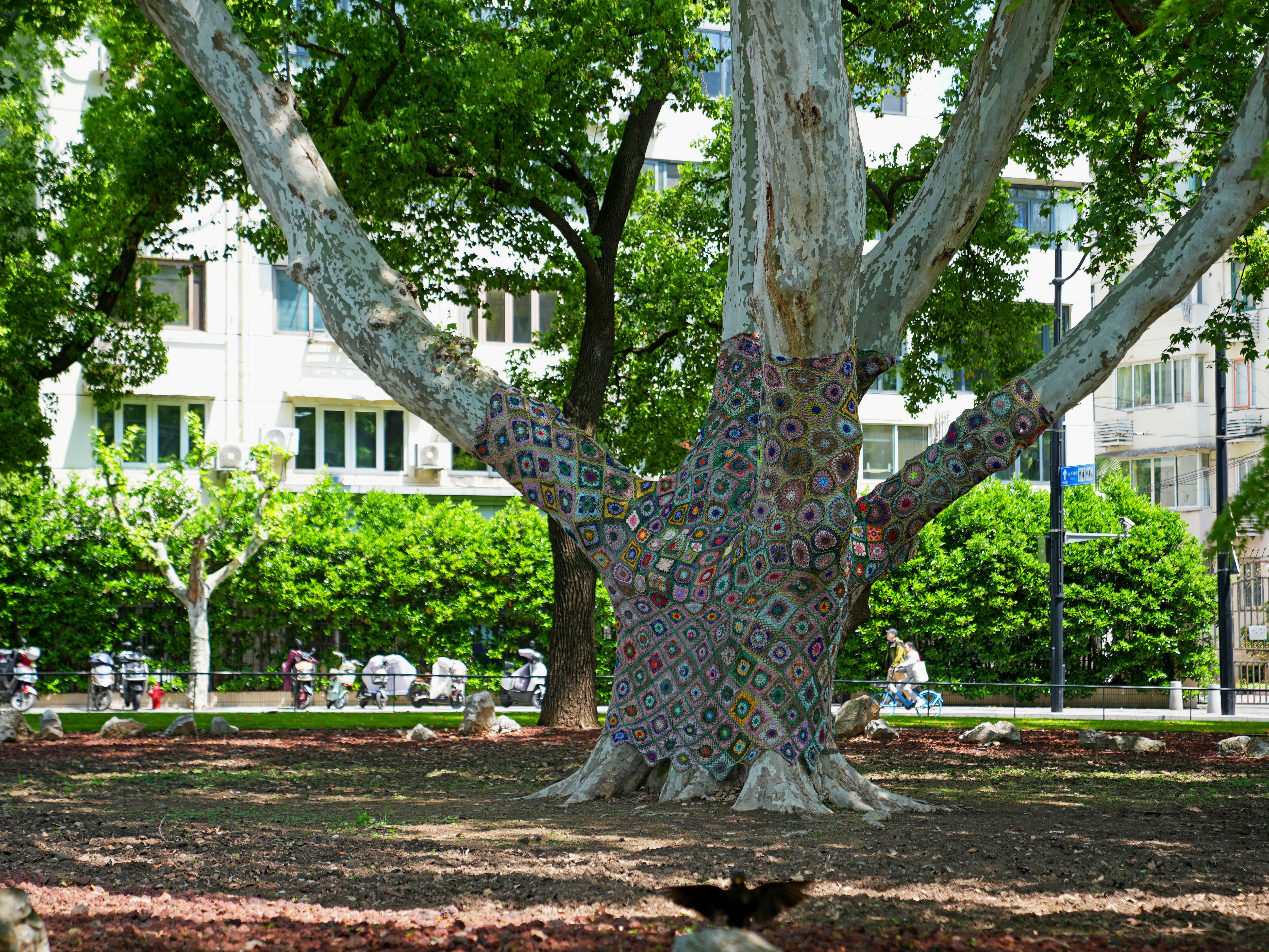 上海市中山公园门前的编号0909悬铃木古树“穿”上了非遗技艺编织的“花衣”,花卉织艺与古树肌理相融,展现出自然之美和手工之韵(4月24日摄)。