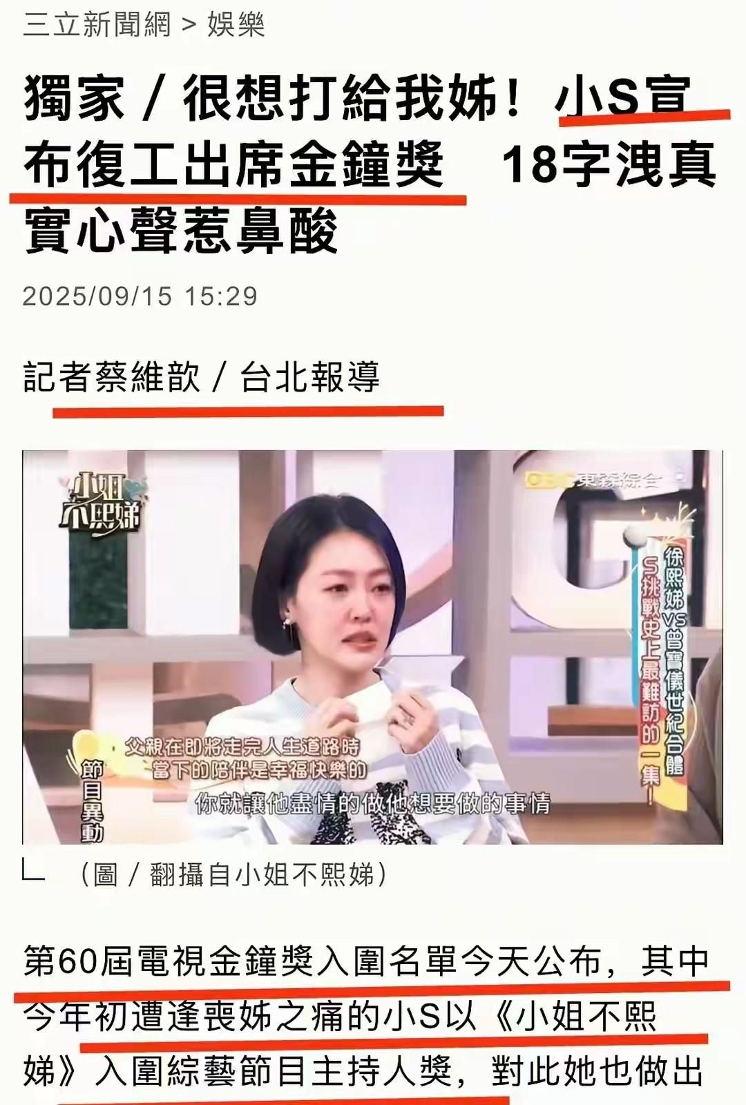 工作室也侧面证实,小s会借着这个机会复出,进入工作状态,之后大概率是不需要吴姗儒再代班主持。随后记者电话采访,表示看到女儿入围这么重要的奖项很开心,希望小s能够拿到最佳女主持,看看到那个时候心情会不会好起来。记者问到她会不会跟着女儿一起参加金钟奖,她表示感谢但是却没有正面回应,给大家留了一点悬念。